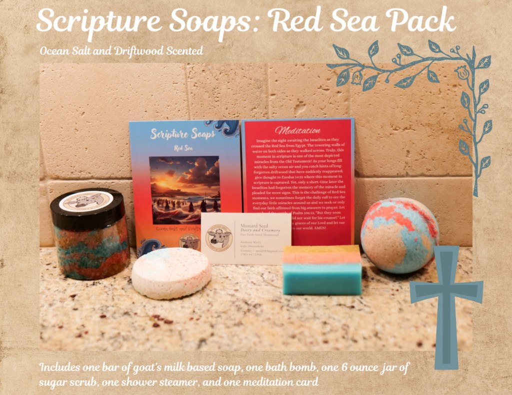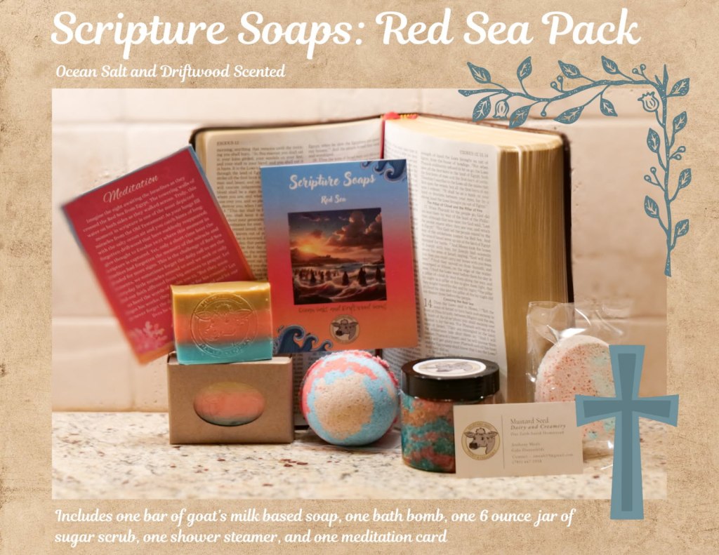 If interested in ordering our first Scripture Soap™ Pack! We just released our first pack entitled the Red Sea! It unleashes scents of Ocean Salt and Driftwood in all the products included in the pack and has a meditation card for scripture devotion while you enjoy the products!